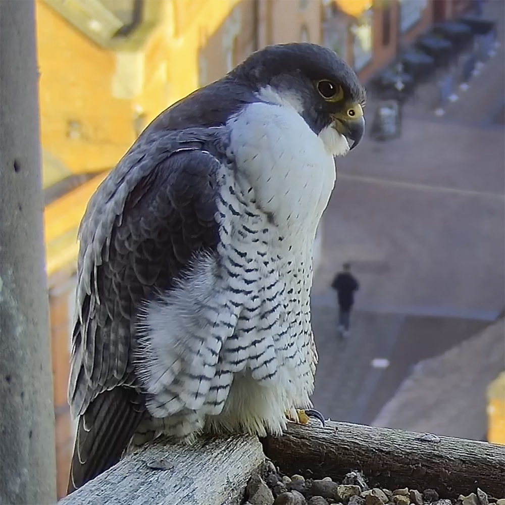 31 Dec – the female flies in at 2:00 carrying fresh Woodpigeon prey which she stashes by a column, then sits on the ledge with a full crop having already fed. She flies off at 7:40 and returns at 8:50. She goes into the box and tends the scrapes, then feeds on the stashed pigeon at 9:05 and flies off with it a few minutes later. The male arrives at 12:05, checks the box then sits on the ledge until flying off at 12:45. He is back a few minutes later with the female looking well fed. He soon leaves but she remains in the box until flying out at 13:25.